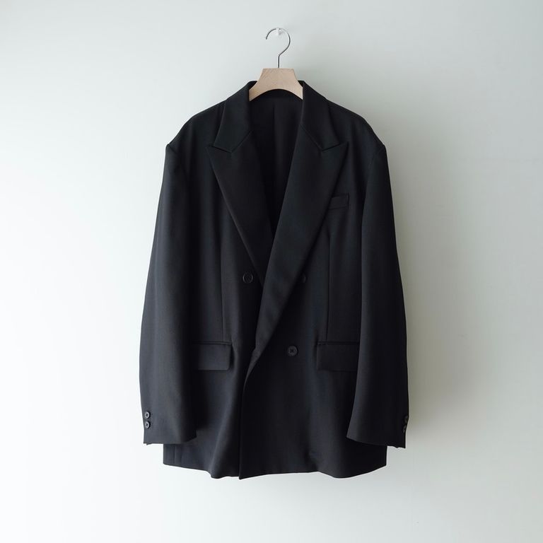 60番双糸の梳毛糸を用いたウールギャバジンを使用し製作を行なった本作。sssteinのジャケットでは比較的すっきりとしたサイズ感に設定しダブルブレステッドジャケットです。