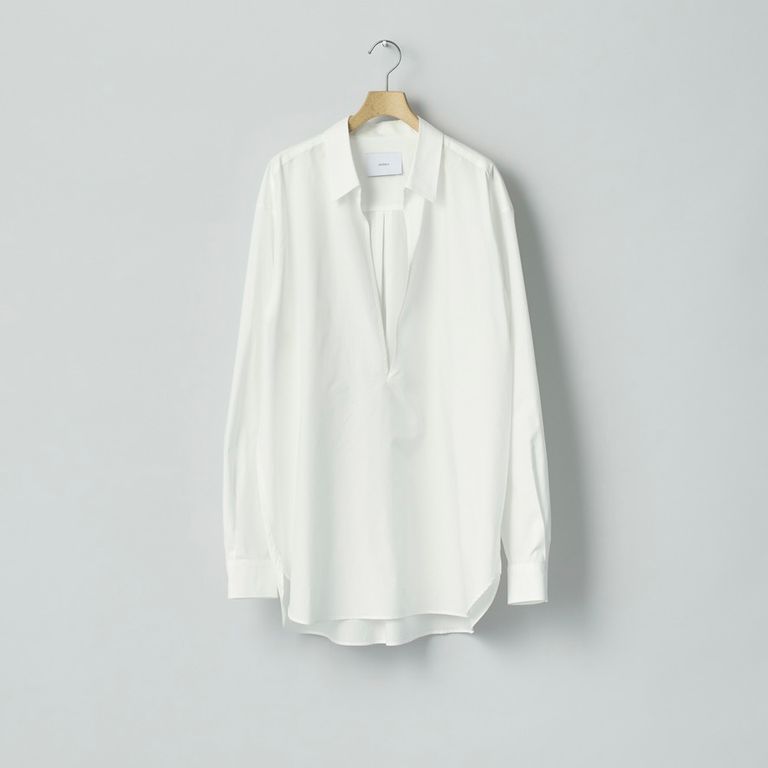 インドの超長綿スビン綿と、もう1種のインドの超長綿をブレンドしたタイプライターを使用し製作を行なった本作。無機質な印象の全体感と、深めの開きが印象的なスキッパーシャツです。