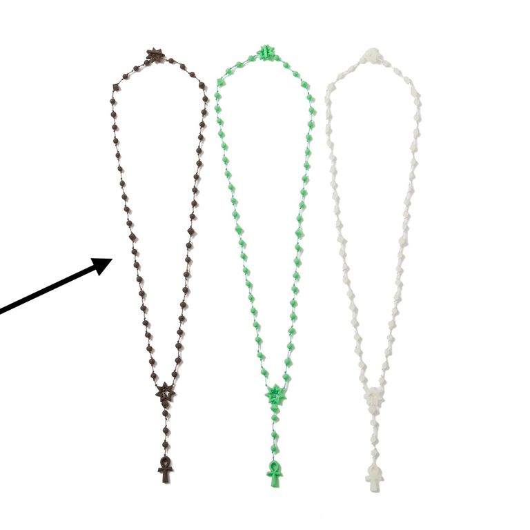通常のロザリオの金属等での仕様と異なり、ラバーで仕上げることで抜け感や遊び心のある印象へ。同型の複数色をジャラジャラと重ね付けして、カスタムいただくのも◎。カジュアルな装いはもちろん、セットアップスタイルのハズしとしてもオススメのアイテムとなっております。