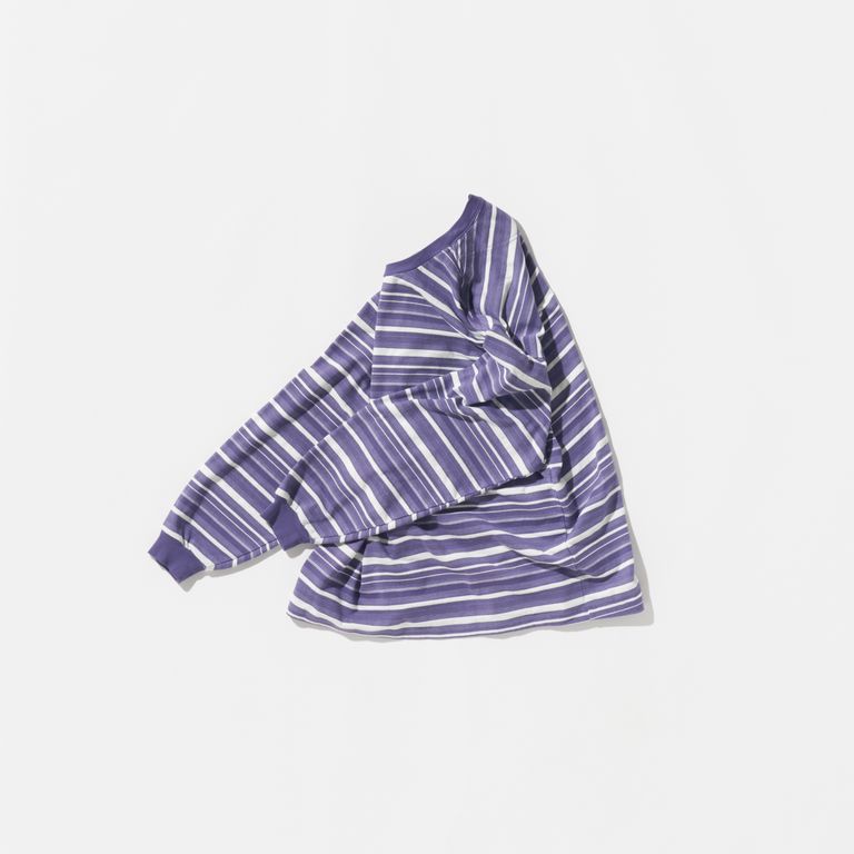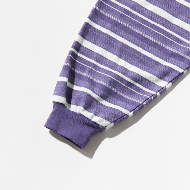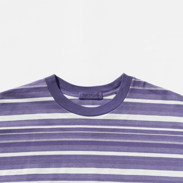 製品染めによってマルチボーダーを表現した天竺素材。綿×ポリエステルの混紡糸、綿、ポリエステルの3種類の糸を組み合わせて構成したオリジナルのボーダー柄は、糸ごとに発色や色の濃淡に違いが現れ、単色の染料のみでマルチカラーボーダーのような奥行きある表情が生まれています。 オールシーズンでご愛用頂けるお奨めアイテムとなっております。