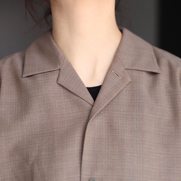 ポリエステルウールの強撚糸使いでシャリ感と張り感がある生地を使用し製作を行なった本作。洗練されたリラックス感が漂う、クラシックなオープンカラーシャツです。