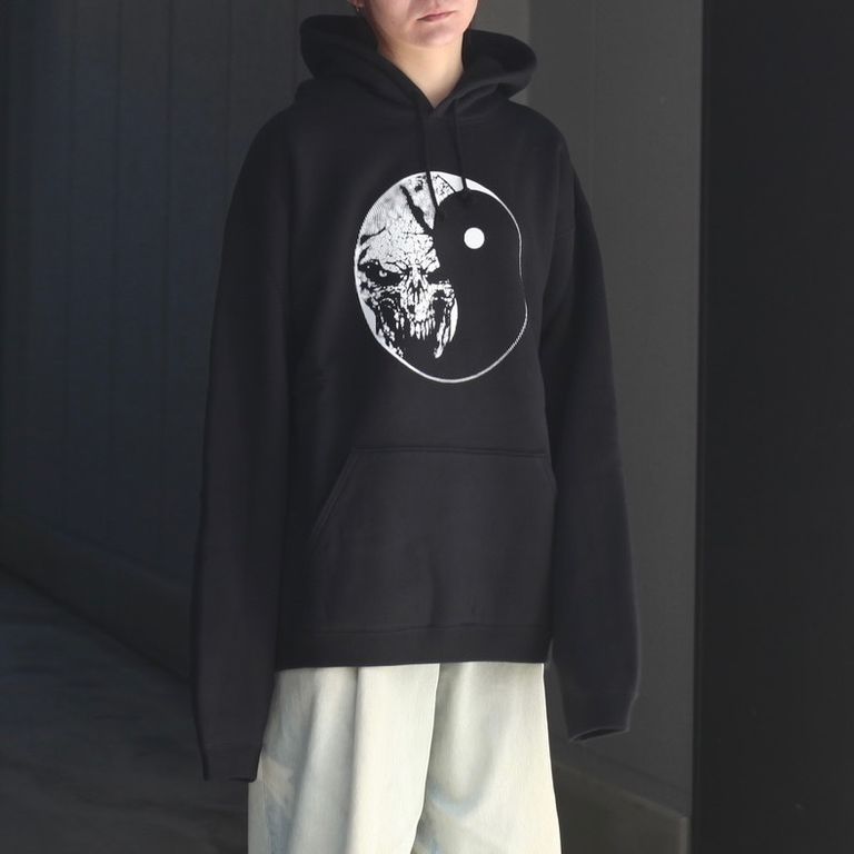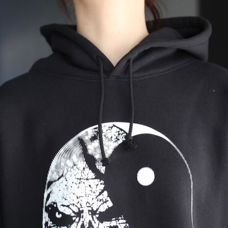 希少な旧式編み機「アズマ編み機」を使用したヘビーウェイト裏毛素材です。アズマ編み機は、吊り編み機から高速編み機へと変わっていった1970年代初期の編み機の一つで、現存数が少ない希少価値の高い編み機です。膨らみのある柔らかい生地感が特徴です。Y's for menをイメージし、MASSESがオリジナルで作成したグラフィックをラバープリントで表現しました。