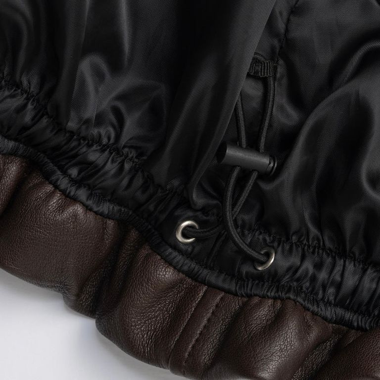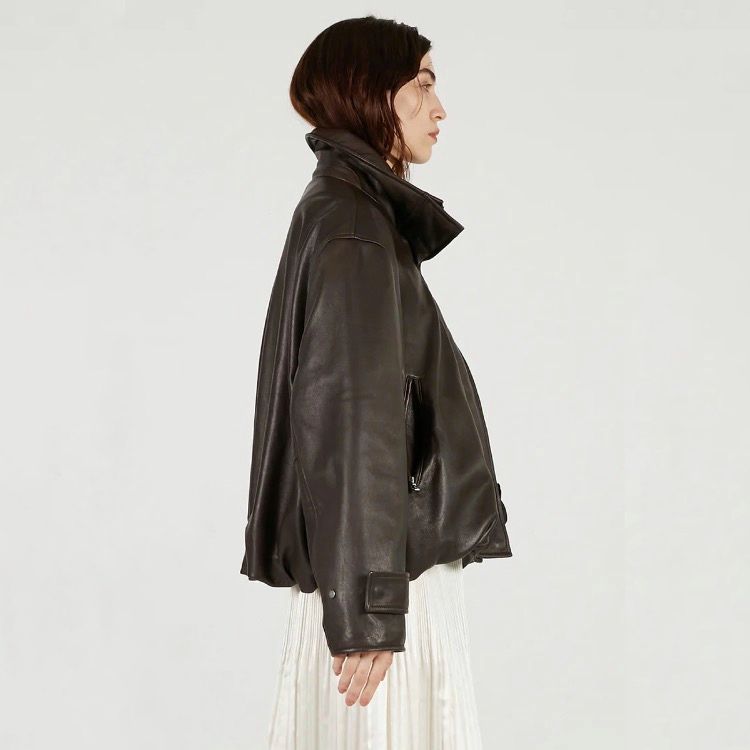 裾のバルーン仕様と顔が隠れるほどのスーパーハイネックがモードな佇まい。肩パッドは取り外し可能でシルエットの変化を楽しめる。ハイクオリティーなシープレザーとミニマルなデザインで長年愛用できる一枚。