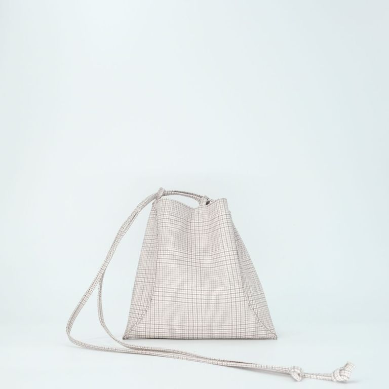 同ブランドでは、定番人気の本作。ピローボックスと呼ばれるジュエリー用のギフトボックスの形から着想したマチの形状がユニークな巾着バックです。手持ち〜ポシェット(肩掛け)としても使用できるように、紐の長さは好みの長さで自由に結べます。