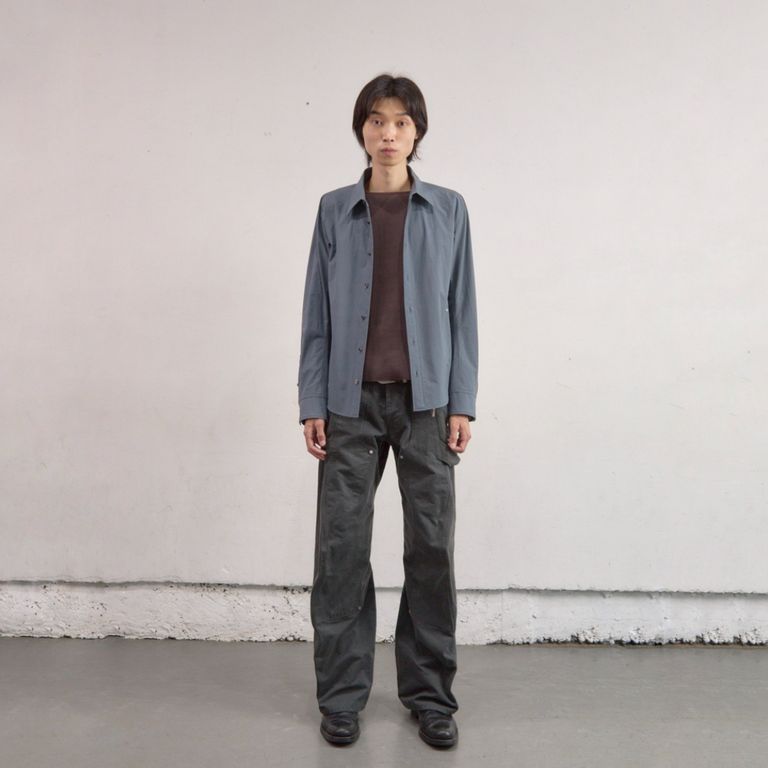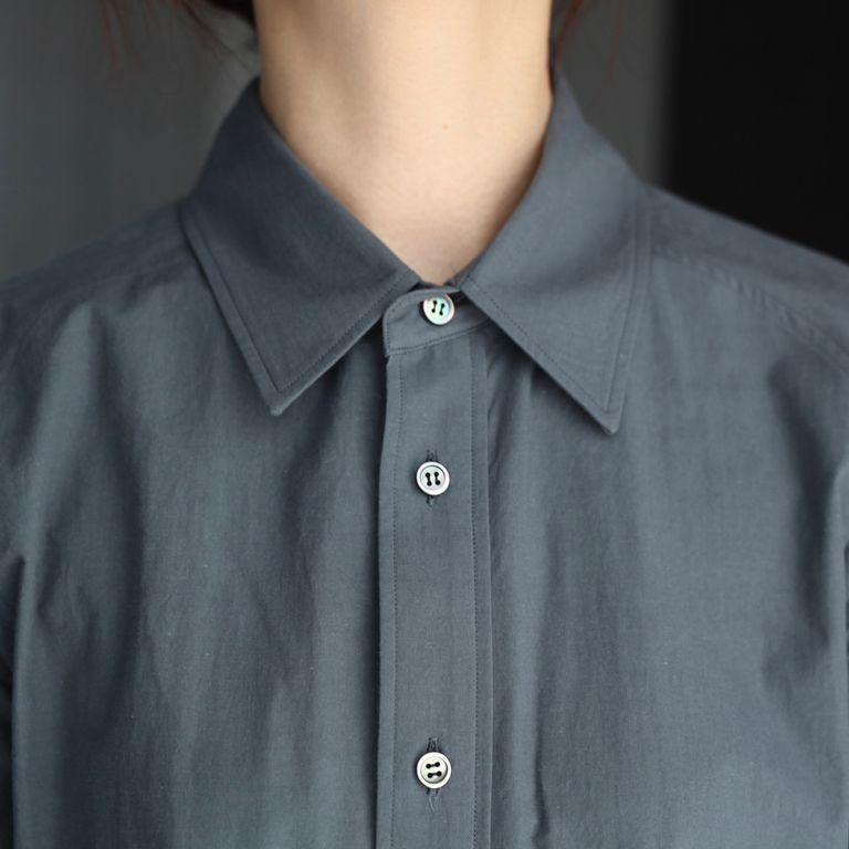コットンダンプ素材を使用し製作を行なった本作。レギュラーカラーのボタンフロントシャツです。