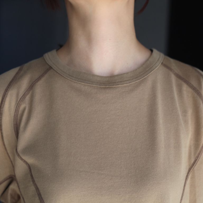 ピヴォットスリーブとフラットシーマー縫製によるパネリングデザインが特徴的な1着。衿ぐりはフライスバインダーネックに加え、重ねてタコバインダー処理を施している為ネック周りがダレにくくなっています。タンブラー処理を施しているため洗濯後も縮みなく着用できます。オールシーズンでご愛用いただけるお奨めアイテムとなっております。