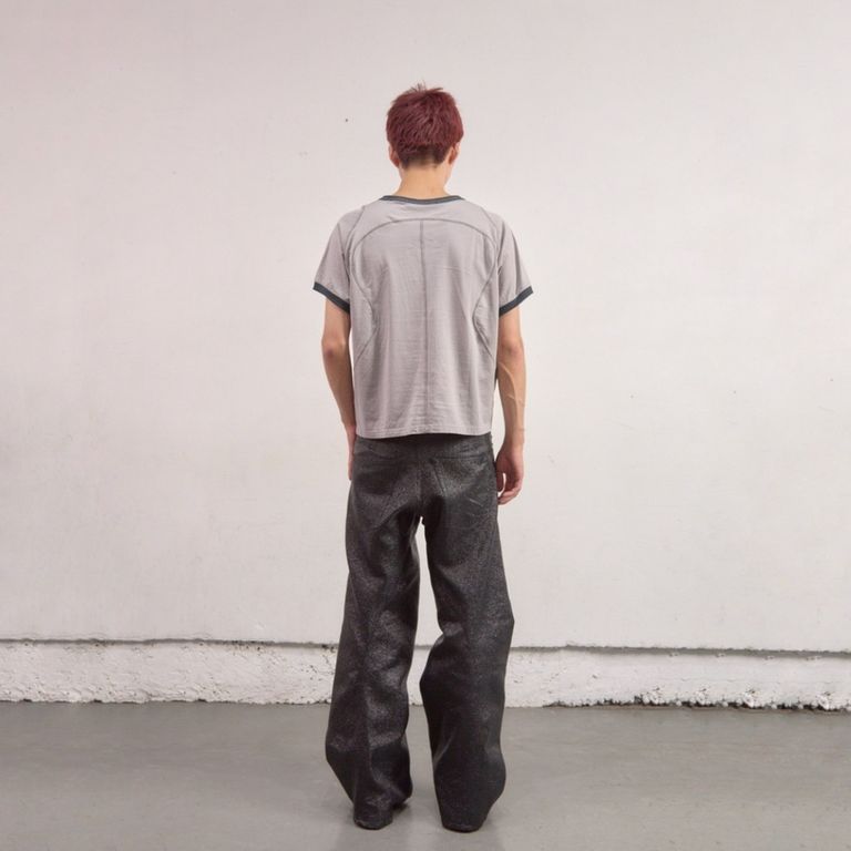 50/2コットン天竺を使用し製作を行なった本作。クロップドレングスのハーフスリーブのリンガーTシャツです。