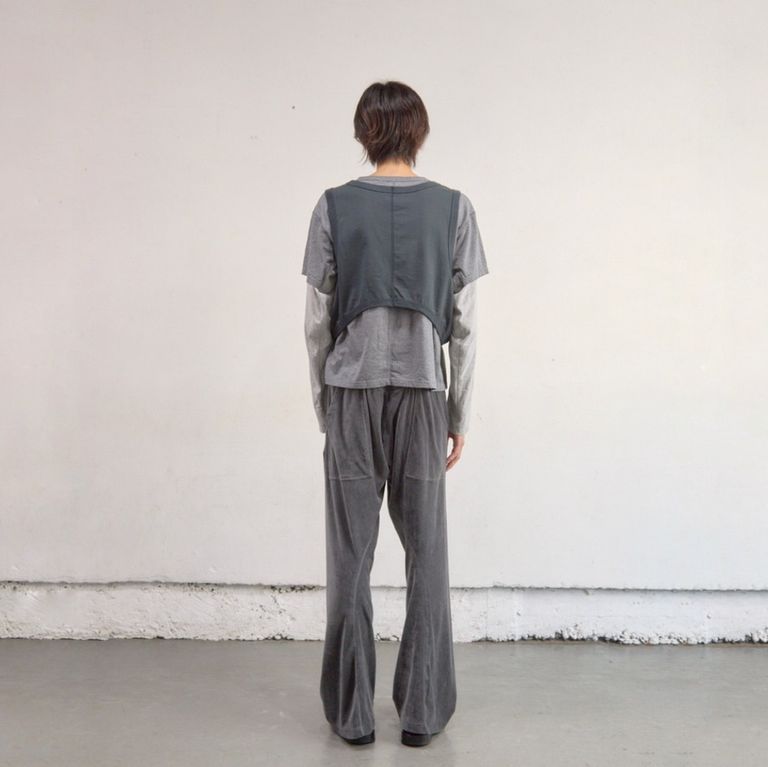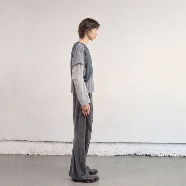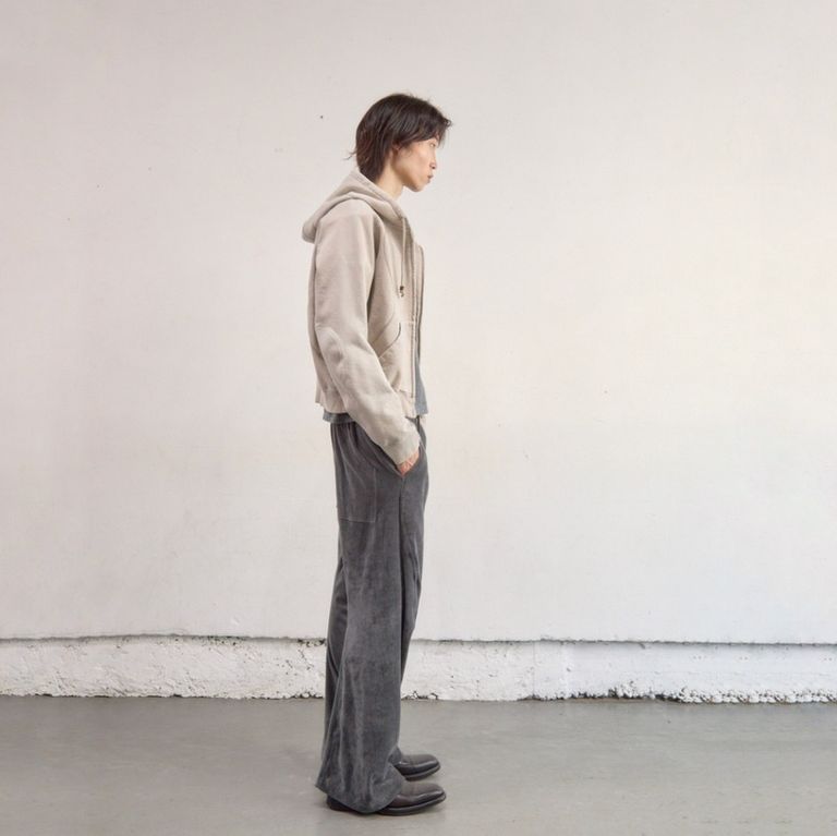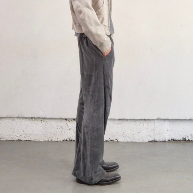NVRFRGTを代表するシグネイチャーアイテムの秀逸なパターンをそのまま用いて、素材を変えて製作を行った本作。コットンベロアを使用したラウンジパンツです。