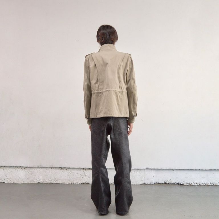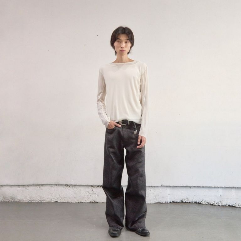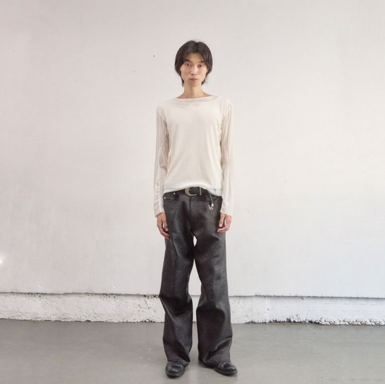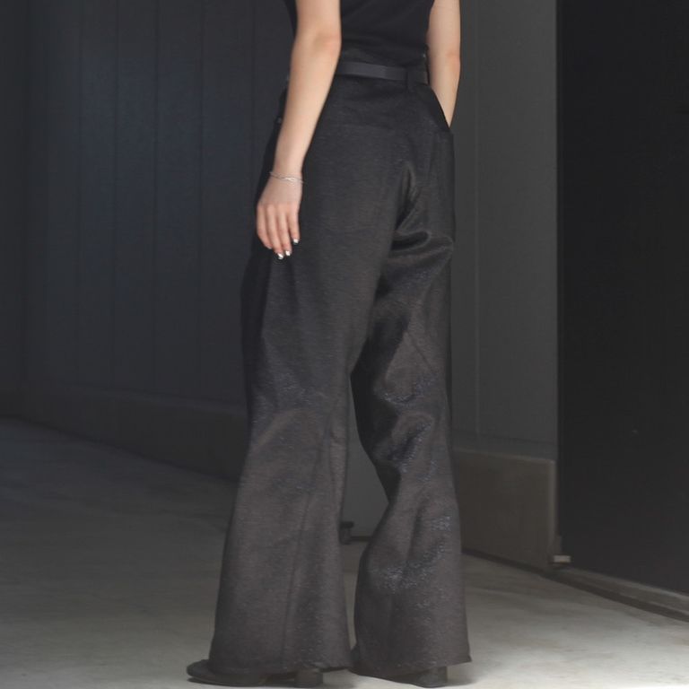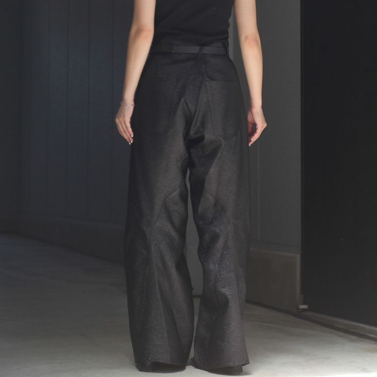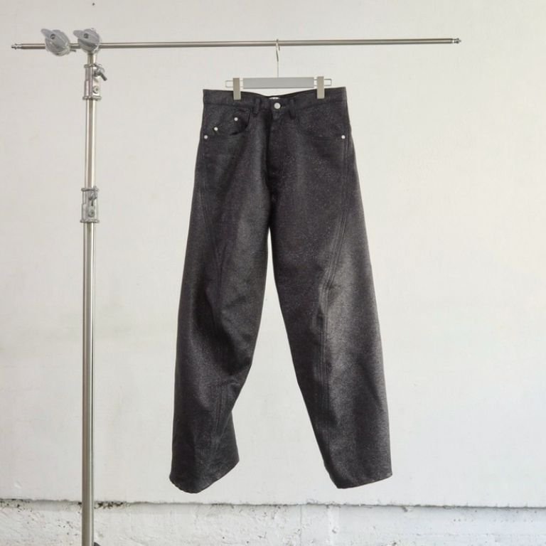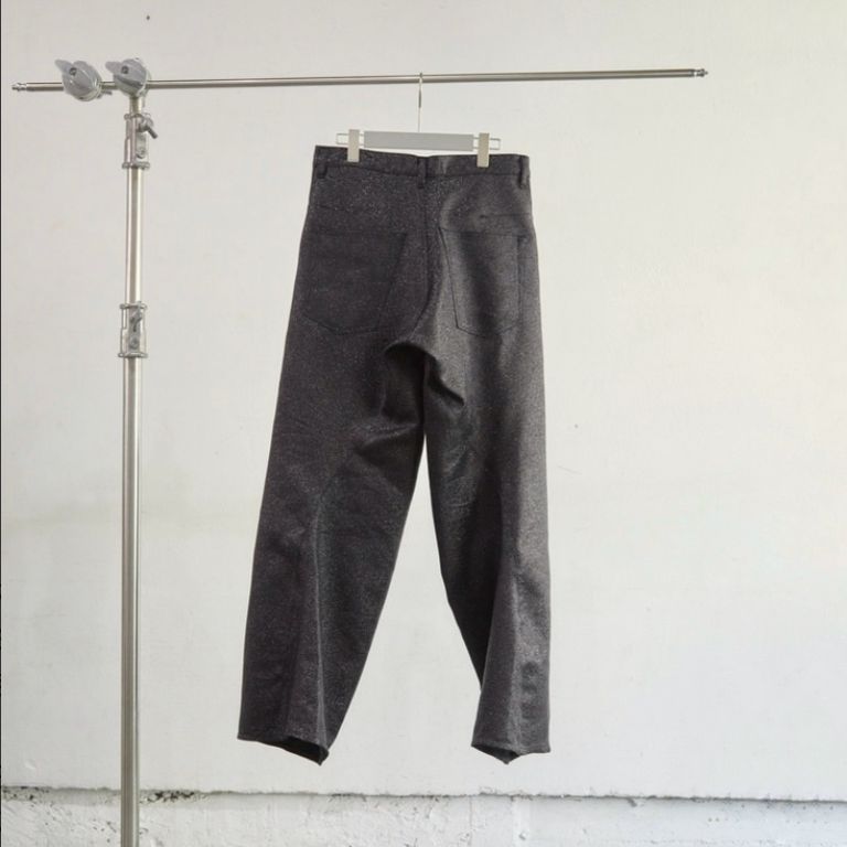 ラメ糸による光沢感が存在感のある1着。00's初期に見られた立体裁断ジーンズから着想し現代的なシルエットに。人間工学に基づいた立体裁断で3Dパターンメイキングを駆使し、膝や足回りの動きやすさを解放する為にサイドシームが大きく捻じれたデザインが特徴です。