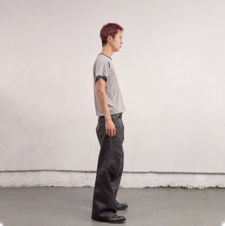 NVRFRGTを代表するシグネイチャーアイテムの秀逸なパターンをそのまま用いて、素材を変えて製作を行った本作。6ozブラックラメツイルを使用したワイドシルエット立体裁断ジーンズです。