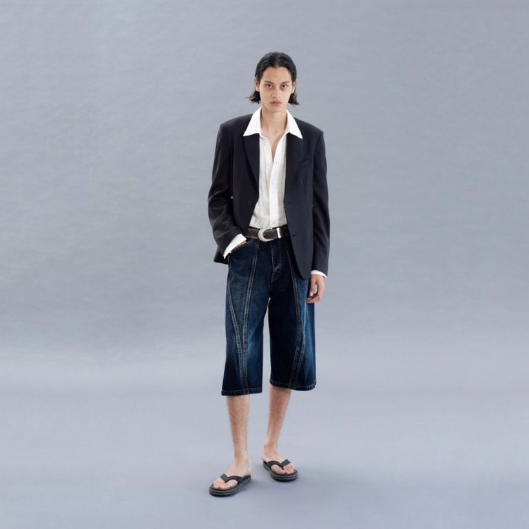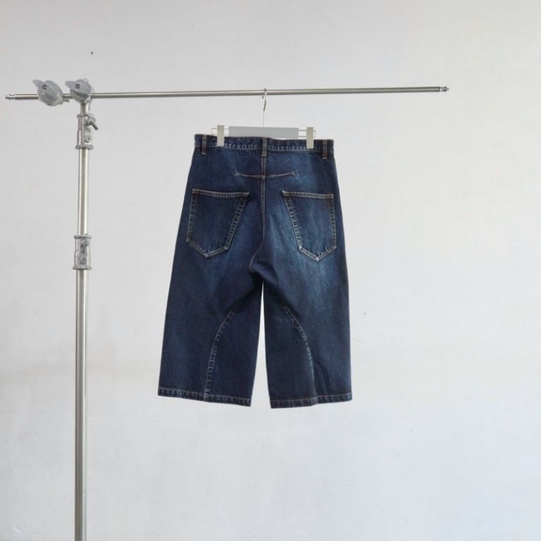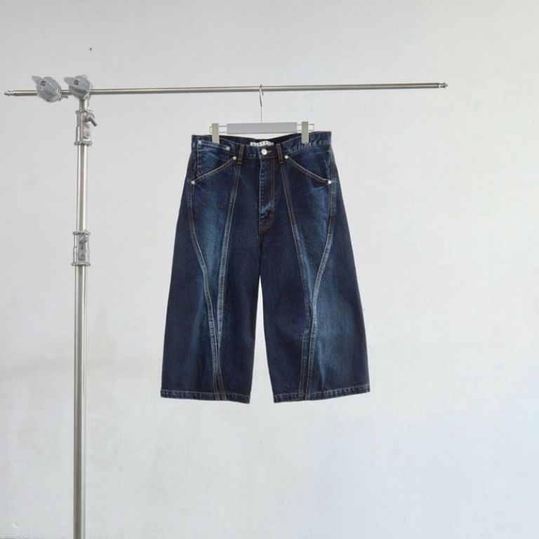 14ozのムラ糸空紡糸によるインディゴデニムを使用し製作を進めた本作。立体裁断による3Dシルエットが特徴的なデニムショーツです。