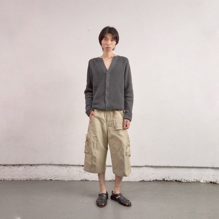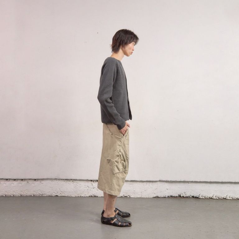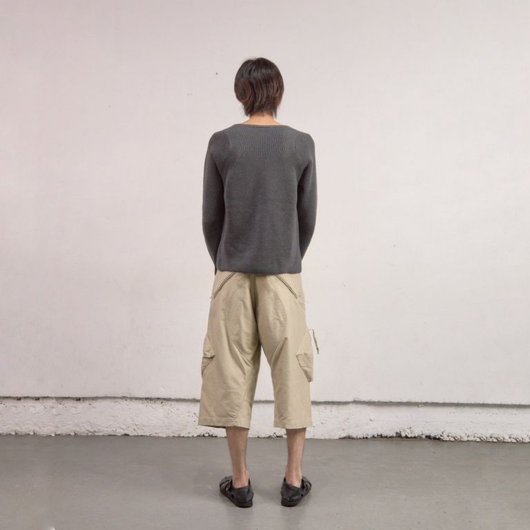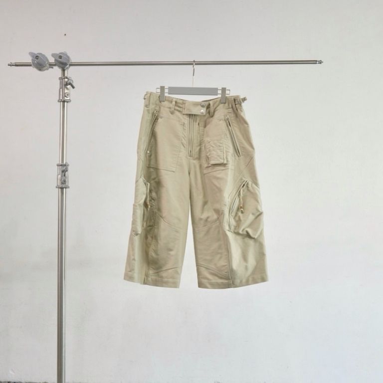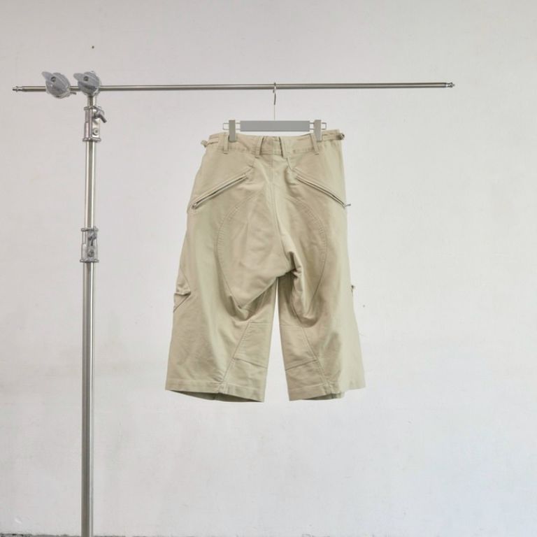 コットンモールスキンを使用し制作を行なった本作。立体裁断マルチポケットパラシュート膝下丈ショートパンツです。