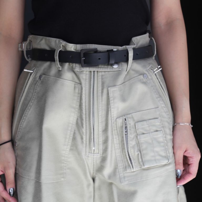 L字型ジッパーあきマチ付きカーゴポケットに前後ジッパーポケット。ニーパッチ,ヒップパッチ付き。サイドアジャストタブによりウエスト調整。スナップ釦とリベットはレーザー彫刻によるオリジナルパターン入り。オールシーズンでご愛用頂けるアイテムとなっております。