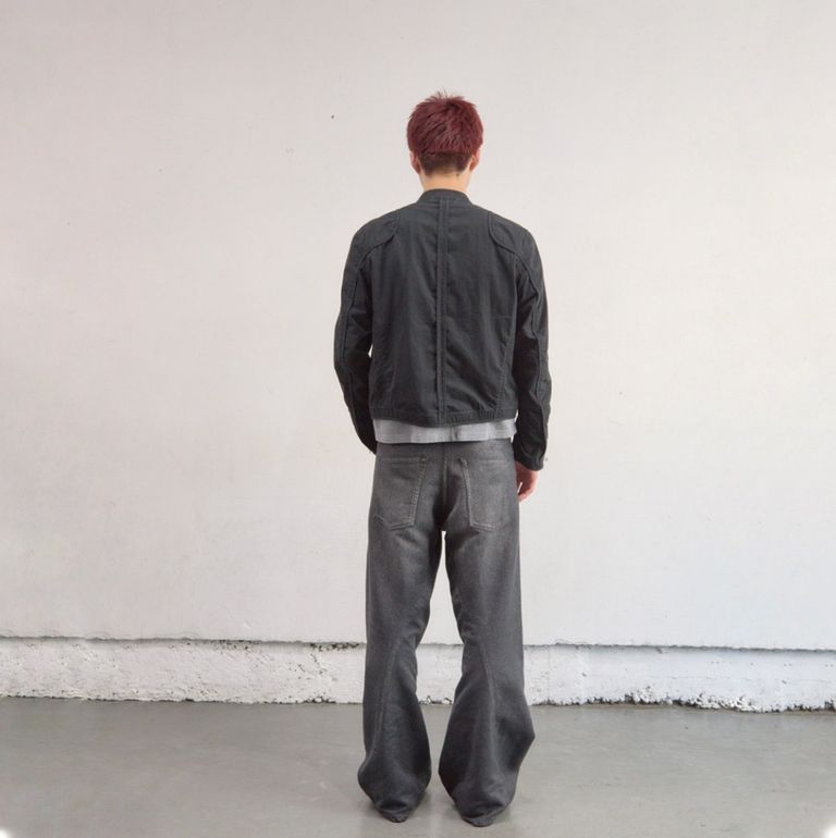 コットンナイロンピーチ起毛素材を使用し制作を行った本作。シングル型のモーターサイクルジャケットです。