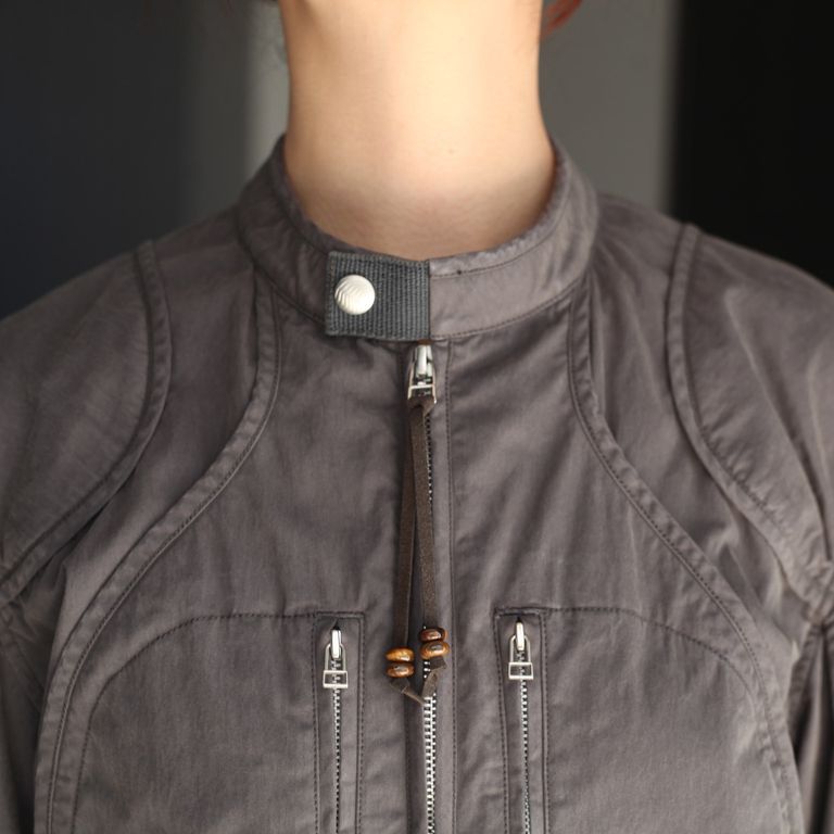 一重仕立てで軽く、衿裏と裾周り裏はアクリルテープ見返し仕立て。製品バイオストーンウォッシュ加工。クロップドレングスでダブルジッパーフロント。パイピングを施したパネリングデザインが特徴。
