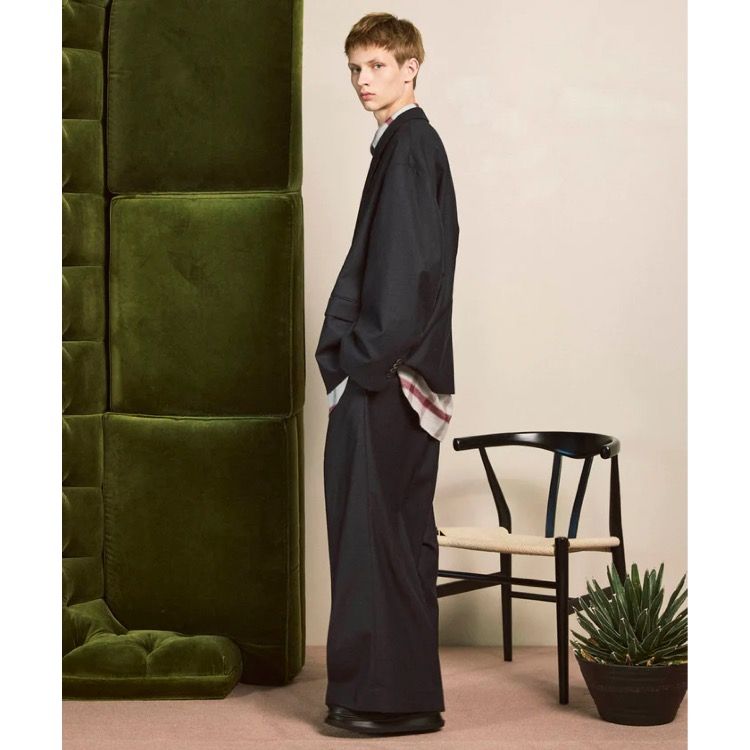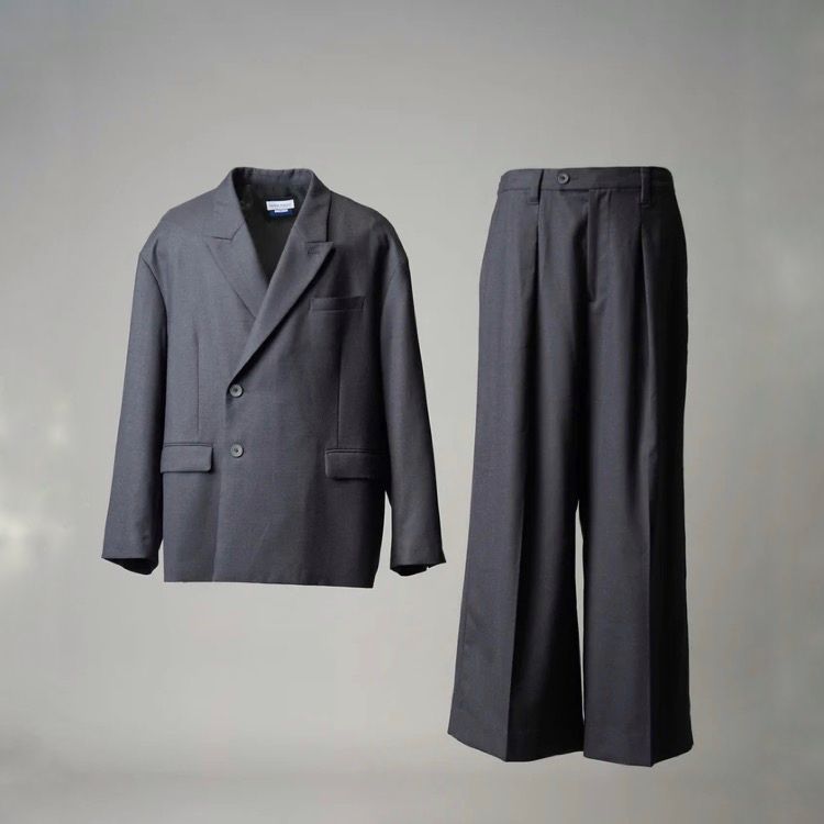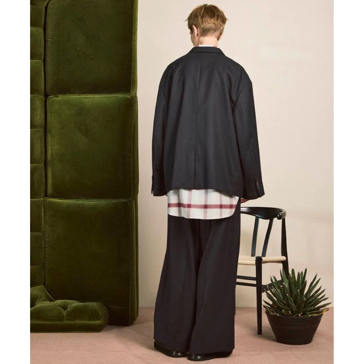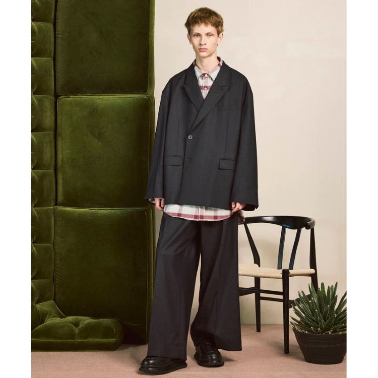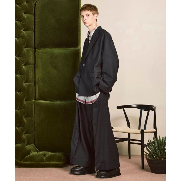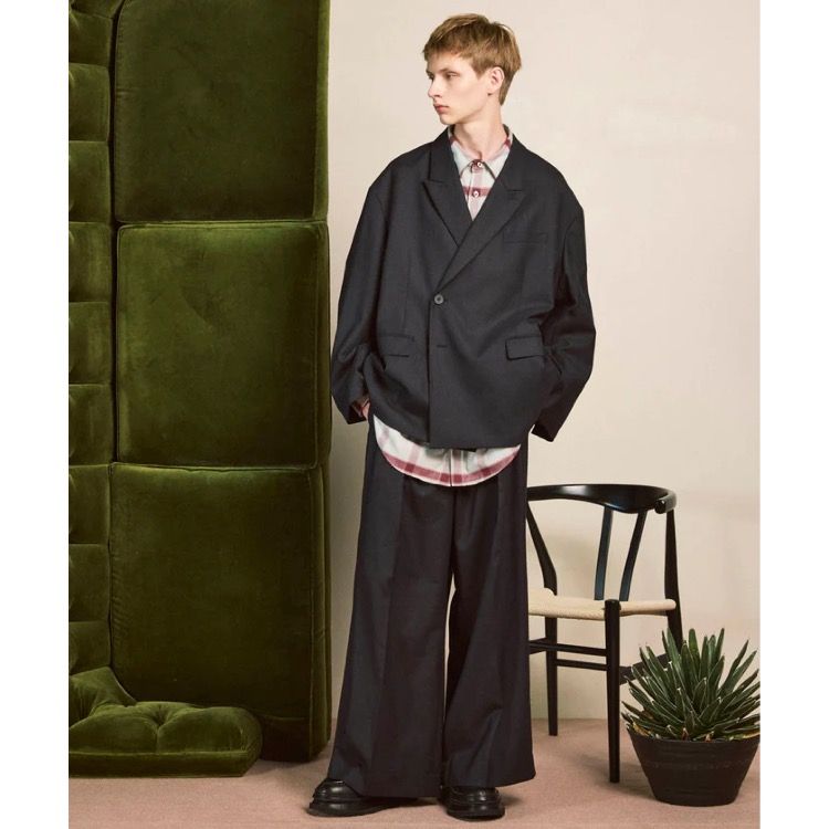 MAISON SPECIAL定番のシルエット。アイテムそのものの品の良さが、オーバーサイズでも野暮ったく感じさせない大人のオーバーサイズシルエットに仕上げております。シルエットによるリラクシングな印象ながら、そのパターンの美しさから野暮ったく見えず、むしろオーバーサイズだからこそ生まれる洒脱さとスタイリッシュさを醸し出します。ジャケットはたっぷりとした身頃の空気感に、やや小ぶりなダブルのピークドラペル。パンツは腰回りをゆったりさせながら裾にかけてストンと落とした、クラシックなインタックのワンタックワイドシルエット。人間の動きを考慮して作成された独自の立体的なパターンは、見た目の綺麗なシルエットを維持しつつも着心地にストレスを感じないものになっております。肩から首にかけて立体的に仕上げ、脇下の身頃など生地分量を調節することにより運動量を確保し、抜群の動きやすさを追求。
