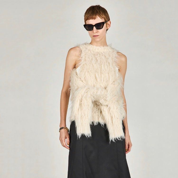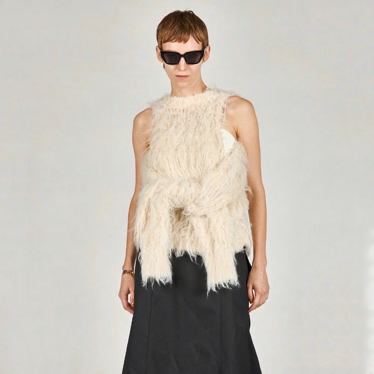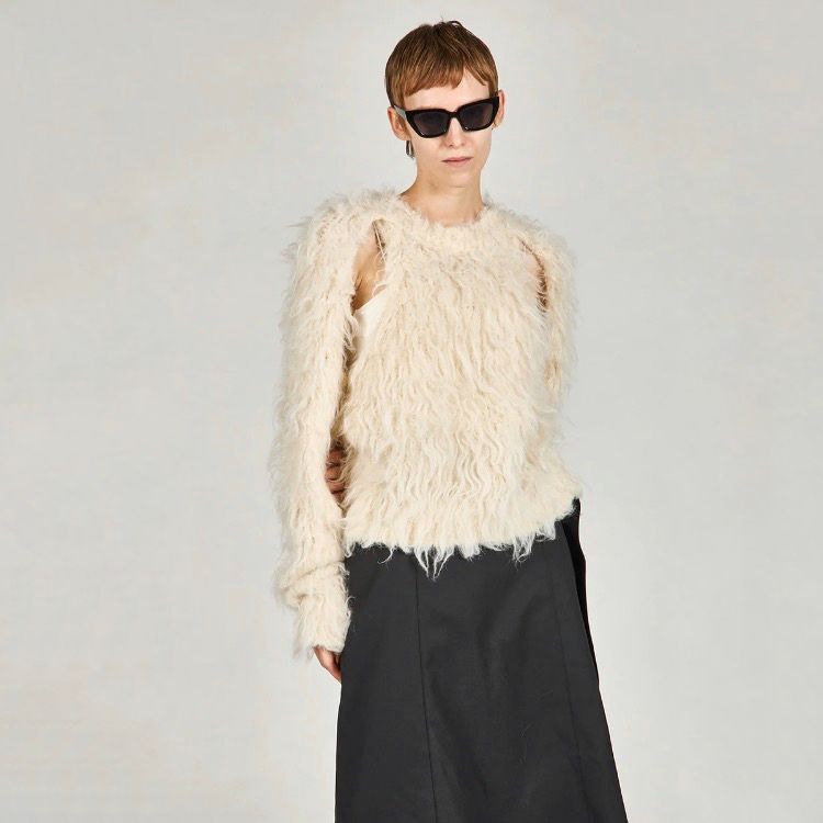 インパクト抜群なシャギーニットプルオーバー。アームホールにスラッシュを施しスリットとしてインナーを見せたり、腕を出してベスト風に着用可能腕を出した場合は袖をフロントで結んだり、肩からかけたり、片側を肩にかけアシンメトリーにしたり、様々なアレンジが出来スタイリングの幅が広がるアイテム。