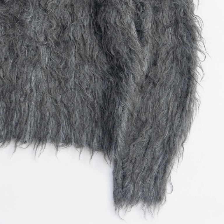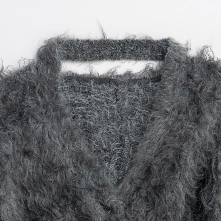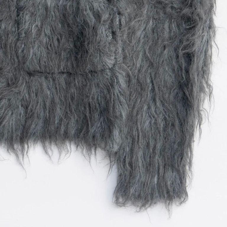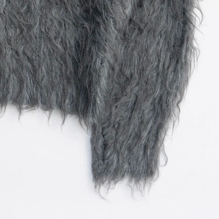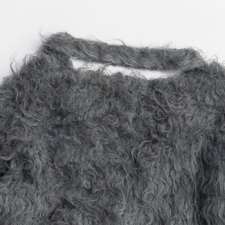 ブークレ糸と毛足のある意匠糸を引き揃え、編み地を丁寧に掻き出してシャギーのボリュームを出している。