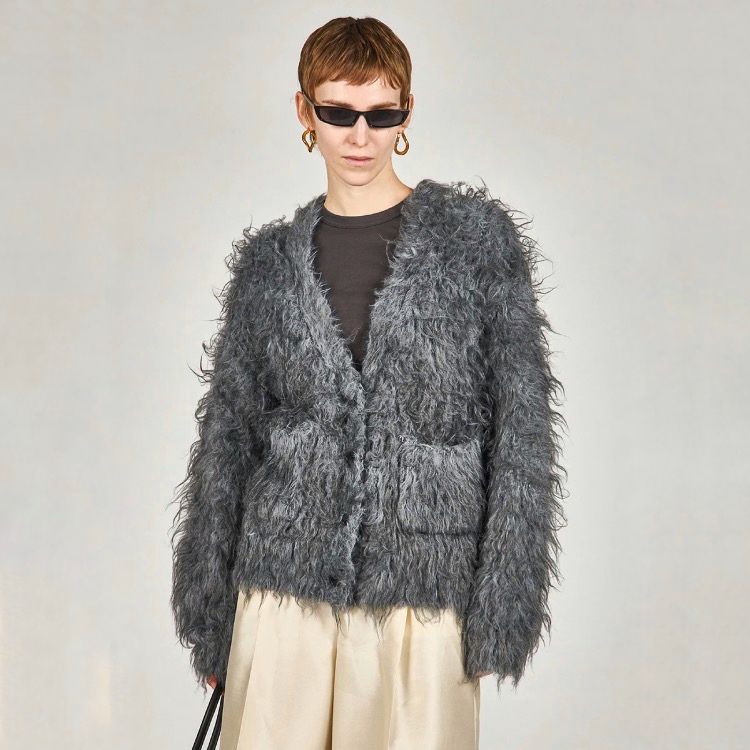 インパクト抜群なシャギーニットカーディガン。素材のインパクトを活かしたざっくりとしたシルエットのカーディガン。後ろのネック部分がスラッシュになっており、抜け感を出している。