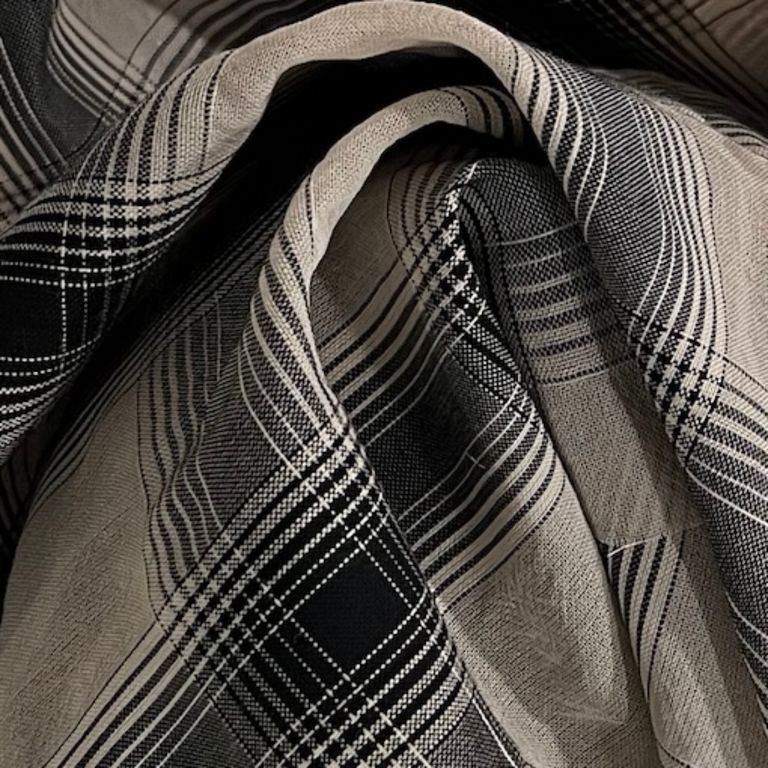 シアー素材ですので透け感のある表情に仕上がり、ストレッチ糸を使用する事により生地の表面に立体感が生まれ、他に類を見ないチェック柄に仕上がっています。オールシーズンでご愛用頂けるアイテムとなっております。