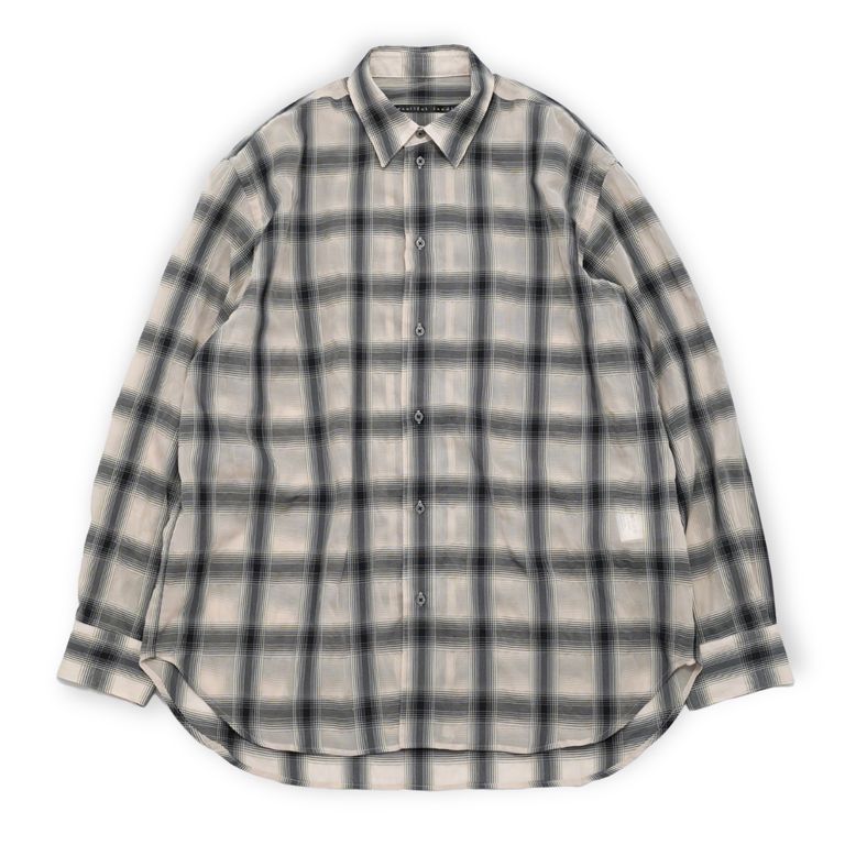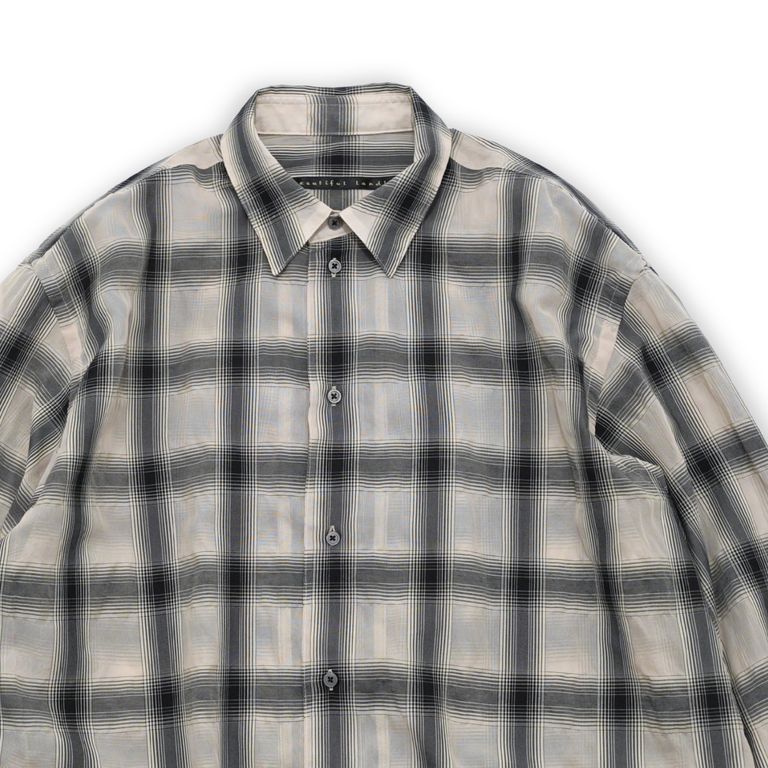 リサイクルポリを使用したシアー感のあるチェック生地を使用し製作をおこなた本作。程よくリラックスフィットなL/Sシャツです。