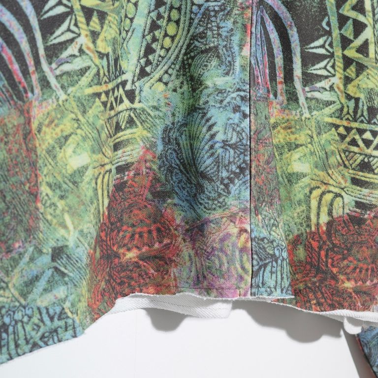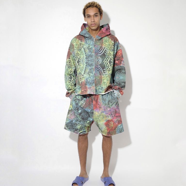 全体にプリント、両脇にシームポケット、フロントにファスナーの仕様が施されております。