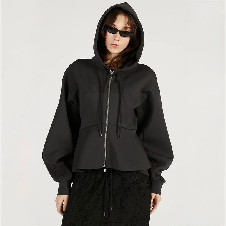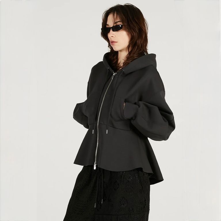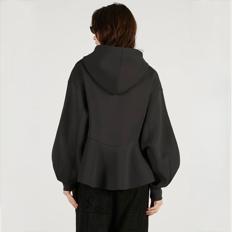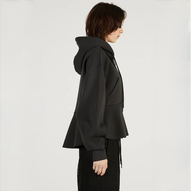 ウエストラインを自然にひき立てるペプラムデザインがカジュアルなフーディーに女性らしさをプラス。切りっぱなしのヘムデザインで程よい抜け感をプラス。軽くてシワになりにくく、デイリー使いしやすい素材感。幅広いシーズンでご愛用いただけるお奨めアイテムとなっております。