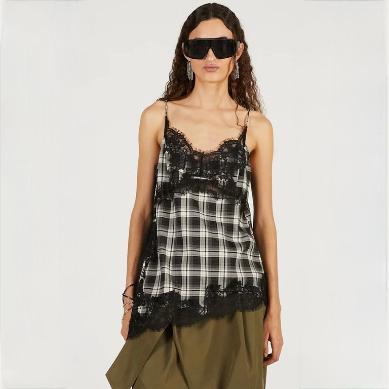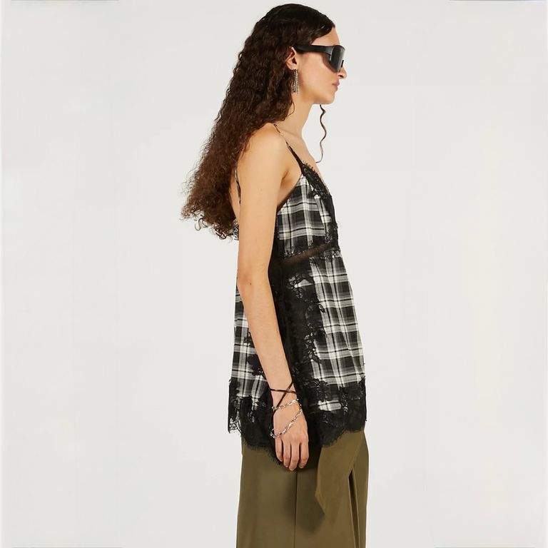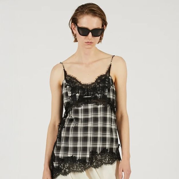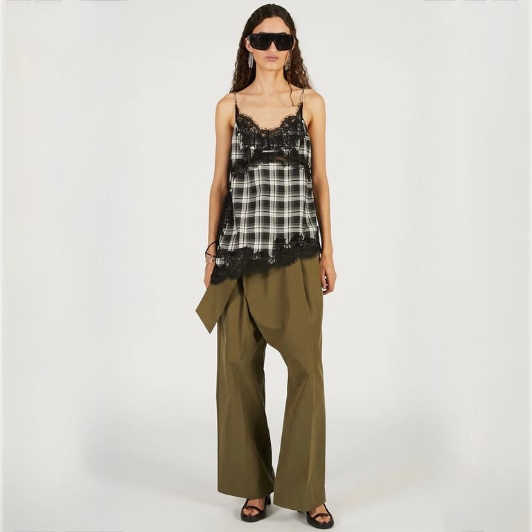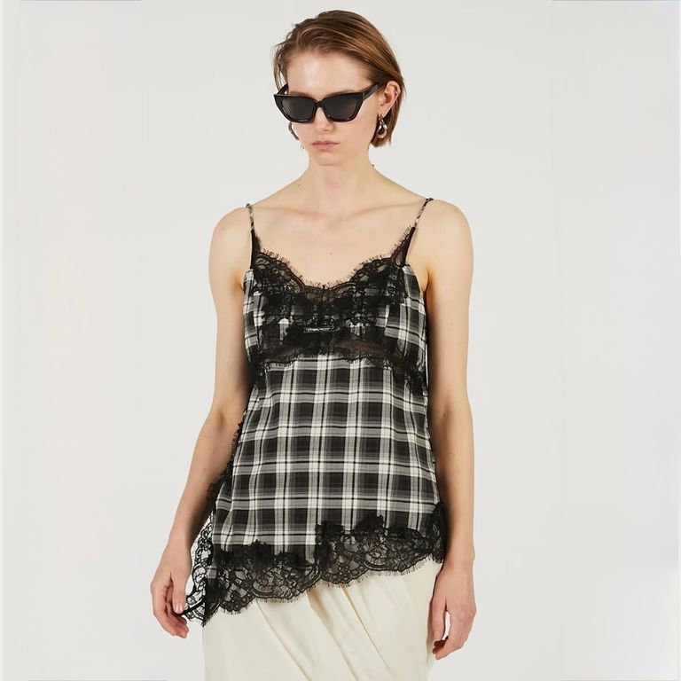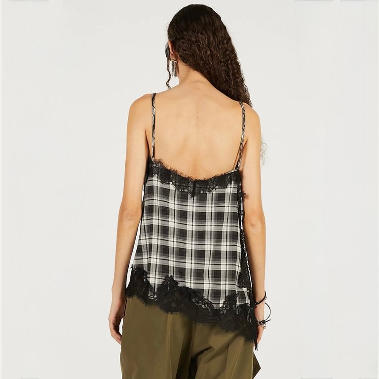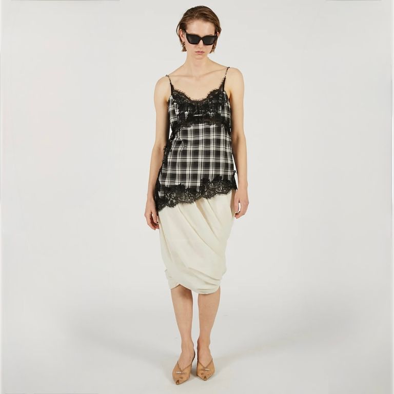ポリエステル/レーヨンの先染めチェック素材を使用し制作を行なった本作。上品な艶感でシーズンレスで快適に着用可能なキャミソールです。