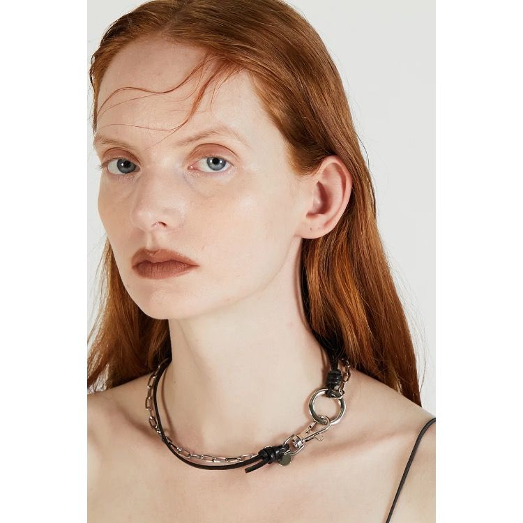 リング部分をフロントにするとポイントになるデザイン。革紐の結び目が可動するようになっていて長さ調節が可能。レザーとチェーンが二重になっております。幅広いシーズンでご愛用いただけるお奨めアイテムとなっております。