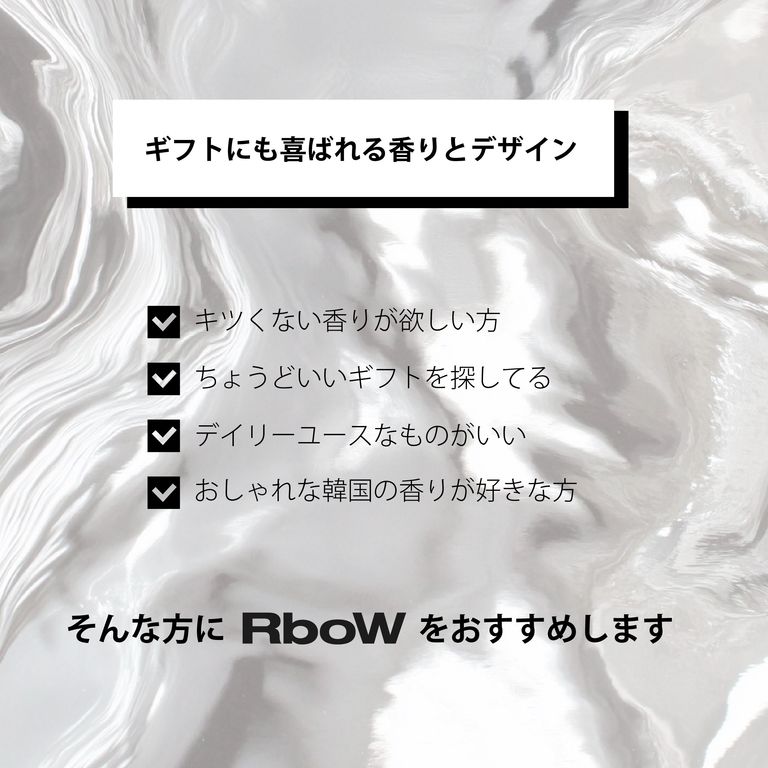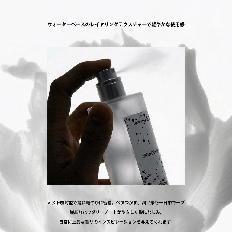 新入荷 定番商品 UNISEX ギフトラッピング可能 セール対象外商品 RboW 【残りわずか】Hair Perfume Mist 50ml(MONOCHROME) ¥4,785 税込 130 ポイント還元 発送目安日:2-3営業日 11,000円(税込)以上お買い上げで 送料無料 この商品は返品/キャンセル/サイズ交換不可になります 注文 サイズ(採寸)情報 質問する お気に入り 内容量 50ml 商品説明 RboW[アールボウ]のヘアパフュームミスト_MONOCHROME 50mlです。同ブランド定番人気の本作。ブランドを牽引し続けているMONOCHROMEの香りで制作されたヘアパフュームミストです。油分層と保湿層を混ぜてから使う微細なオイルのコンディショニング効果を備えたヘアミストは、自然なうるおいとツヤを与え、しっとりまとまりやすい髪に整えてくれます。濡れた髪、乾いた髪どちらにも使える軽くてエアリーな使い心地。この上なく良い香りを提案する同ブランドは、ユニセックスでご愛用可能。ご自身用はもちろん、贈り物にもお奨めのアイテムとなっております。使用方法:オイル層と水分層がよく混ざるように十分に振った後、濡れた髪や乾いた髪に適星をスプレーして軽くなじませてください。香りについてMONOCHROME(モノクローム)香りの印象自然の息吹を感じるフレッシュフローラルの香り。朝露に濡れた爽やかなグリーンティーと、鼻先をそっとタッチするレモンとピーチの優しい香り。そよ風で運ばれてきたほのかなライラックと、上品で優雅なピオニーの華やかなブレンドを心地よいシダーウッド、温かなムスクが繊細に包み込み、落ち着いて洗練されたフローラルの香りへと昇華。まるで花々が咲き誇る庭園に佇んでいるかのよう。付属品についてRboW BOX付き。 RboW[アールボウ]についてDIRECTOR : キム・ソヒョン氏FROM : KOREAFOUNDED : 2007年RboWは、アートディレクターのキム・ソヒョン氏が手掛ける韓国ソウル発のブランド。自身そのものをアーティスティックに表現することを提案するアートプラットフォームブランドです。香水、ハンドクリーム、キャンドル、ルームディフューザーなど、香りを中心に展開。有名メゾンの香水を世界に生み出した調香師たちが、アートへの解釈に基づき、それぞれの香りを唯一無二の表現としてクリエイトしています。ブランドコンセプトは「持ち運ぶことができる自分だけの小さなアート」で、香りやパッケージデザインで日々の生活にアートを取り入れ、自己表現のツールとして楽しむことを提案。またブランド名「RboW」の意味は、「虹」を意味し、虹を見つけた時の喜びや「美しい偶然」「嬉しい出逢い」をアイテムを通して感じてほしいという願いが込められています。 詳細情報 成分 水、エタノール、イソドデカン、安息香酸アルキル(C12-15)、炭酸ジカプリリル、ラウリン酸イソアミル、水添ポリイソブテン、2,3-ブタンジオール、パンテノール、安息香酸Na、塩化Na、EDTA-2Na、ヒドロキシアセトフェノン、トコフェロール、ヤシ油、クエン酸、クエン酸Na、アカシアコンシナ果実エキス、タマリンド果実エキス、香料 内容量 50ml ブランド RboW 品番 HAIR PERFUME MIST[MONOCHROME] カテゴリ コスメ/香水 > ヘアケア 性別 ユニセックス 返品 不可 ラッピング 可能 発送目安日 2-3営業日 配送方法 佐川急便(送料について) お支払い方法 本商品でご利用可能な決済方法は下記となります。各お支払い方法についての詳細はショッピングガイドをご覧ください クレジットカード払い セキュリティコードとはクレジットカード裏面のサイン欄上部に記載されている数字の一番右の3桁の数字です。アメリカン・エキスプレス・カード提携のクレジットカードの場合、セキュリティコードはクレジットカード表面に記載されている4桁の数字となります。 Amazon Pay 楽天ペイ 銀行振込 3営業日(土日祝は含まず)以内にお振込みください。ご入金を確認次第、入金確認メール(通常商品)又は予約受付完了メール(予約商品)を送信いたします。 あと払い (ペイディ) 事前登録不要、クレジットカード登録不要。 メールアドレスと携帯電話番号だけで、今すぐ購入可能。 お支払いは翌月27日までに、コンビニ払い・銀行振込・口座振替で。 1か月に何度購入しても、お支払いは翌月まとめて1回でOK。 さらに、ペイディアプリから本人確認をすると、分割手数料無料*の3回あと払い**、ご利用可能額の確認、使い過ぎを防止する予算設定など、便利な機能がご利用いただけます。 *口座振替・銀行振込のみ無料 **1回のご利用金額が3,000円以上の場合のみ利用可能 代金引換(現金/クレジットカード) 配達時に現金で決済が可能な代金引換サービス。 ご予約、お取り寄せでのご注文ではご利用いただけません。 サイズ(採寸)情報 内容量 50ml このアイテムをシェア この商品について質問する お問い合わせの入力内容が失われますがよろしいですか?