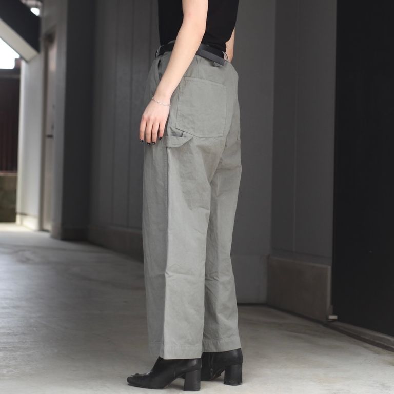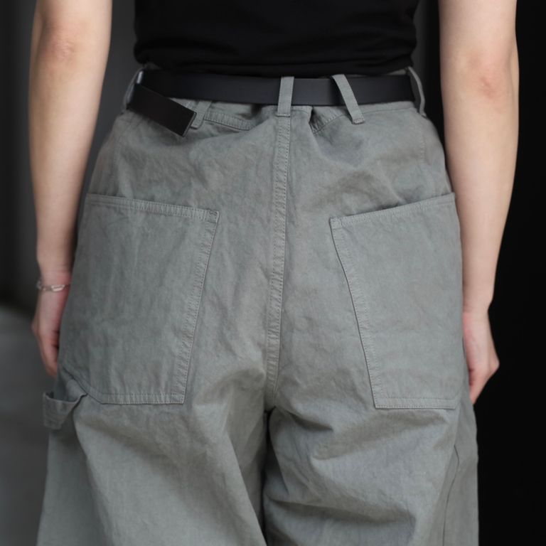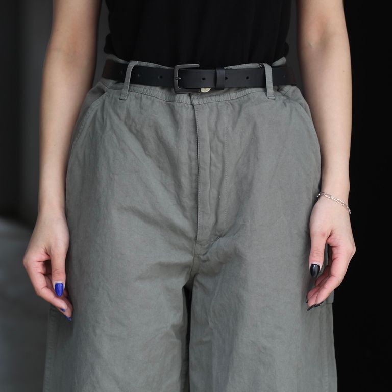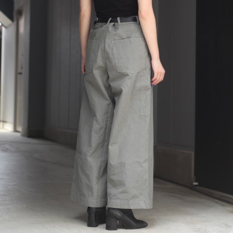 40番手高密度で織り上げたウェザークロスを使用し製作を行なった本作。近江晒で揉み洗いし、製品染めする事で、着込む程に馴染むのが特徴のワイドパンツです。