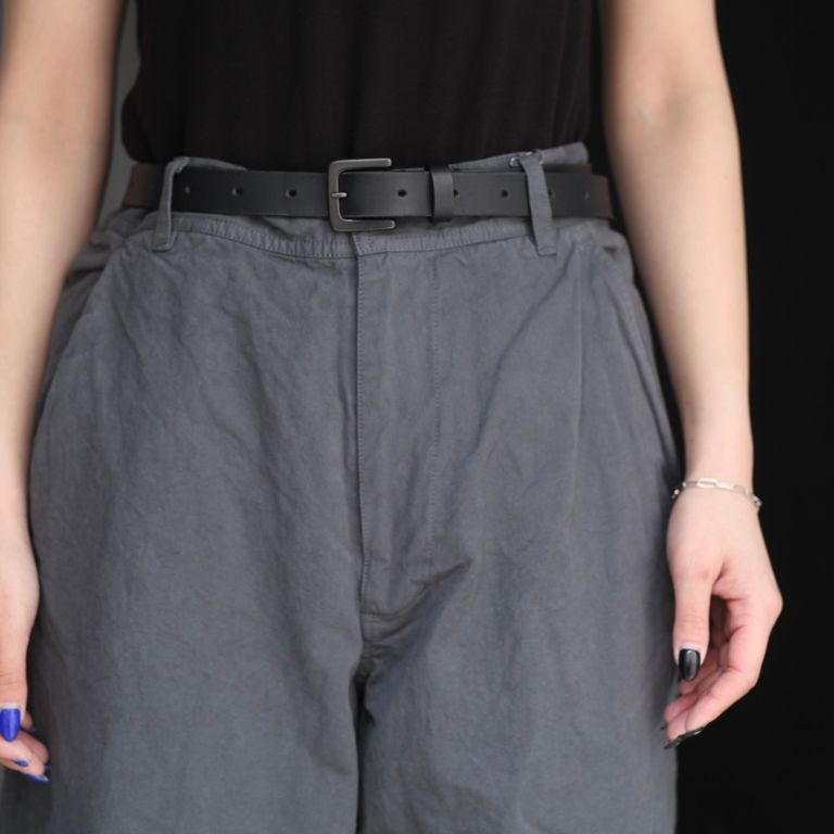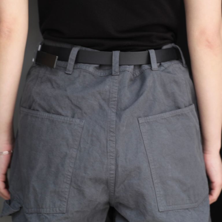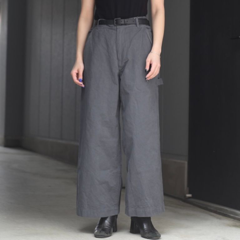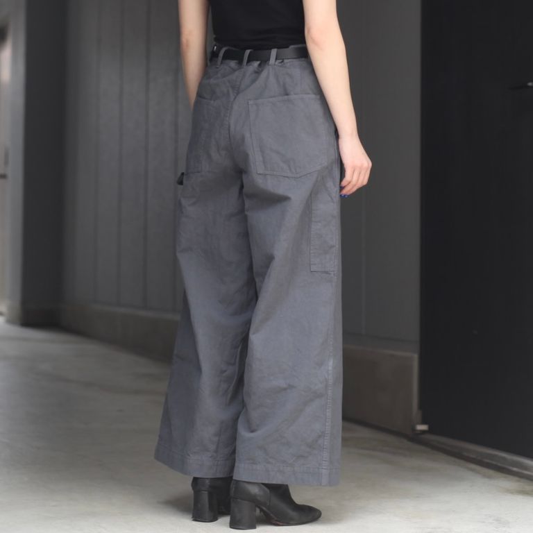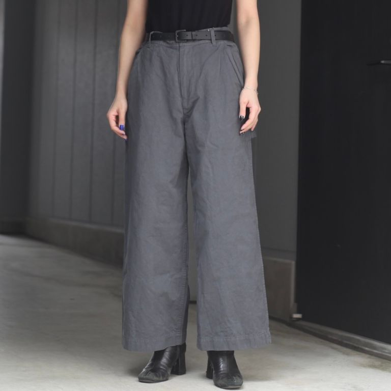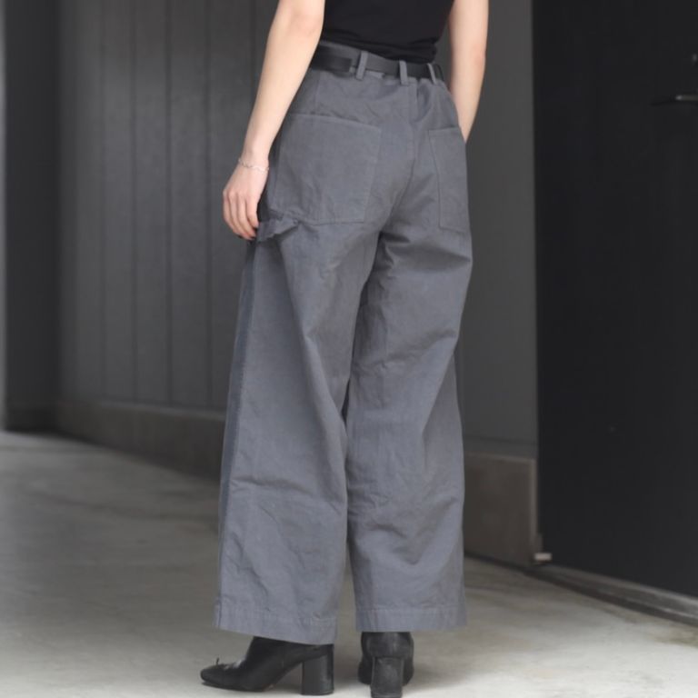 40番手高密度で織り上げたウェザークロスを使用し製作を行なった本作。近江晒で揉み洗いし、製品染めする事で、着込む程に馴染むのが特徴のワイドパンツです。