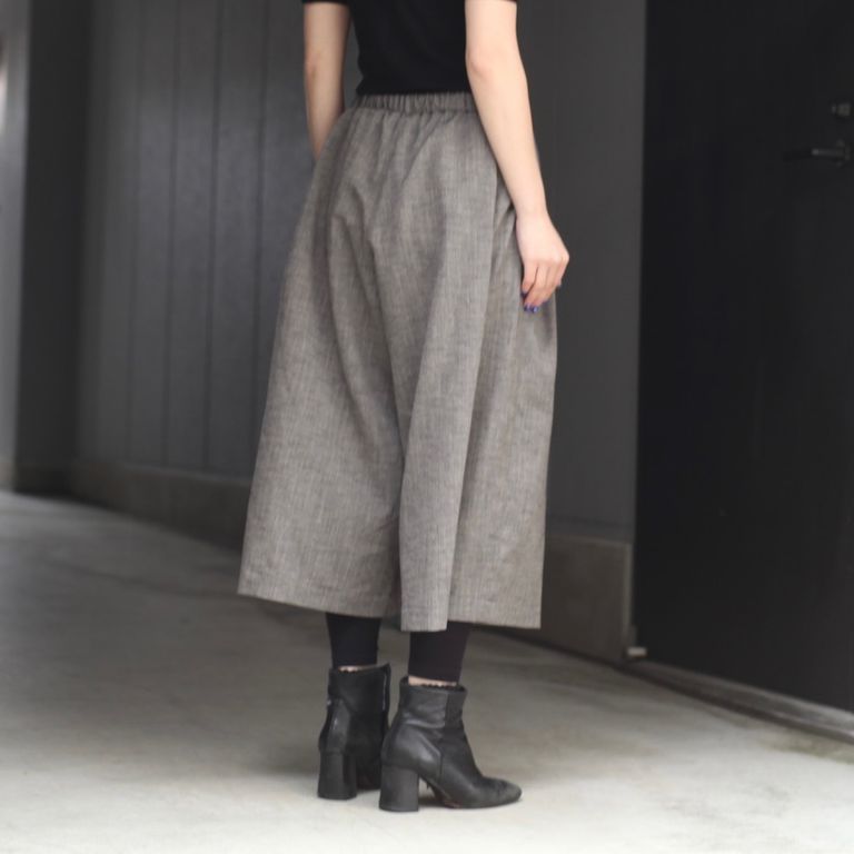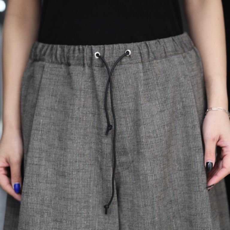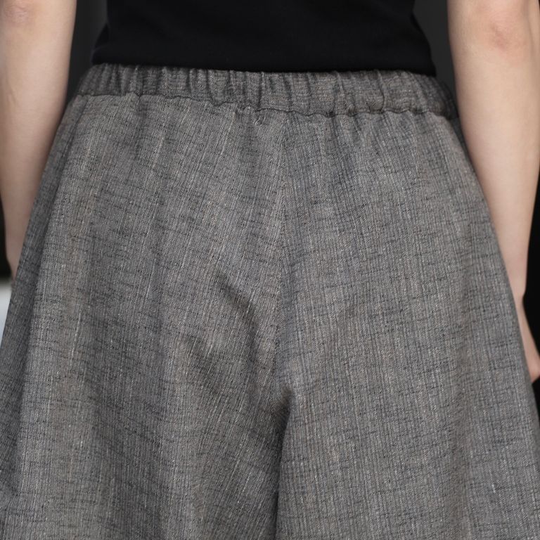 通気性のよいシャリ感のあるメッシュ組織のかすり糸を使用したツイード調素材を使用し製作を行なった本作。ボリュームを持たせた、ハーフ丈のイージーショーツです。