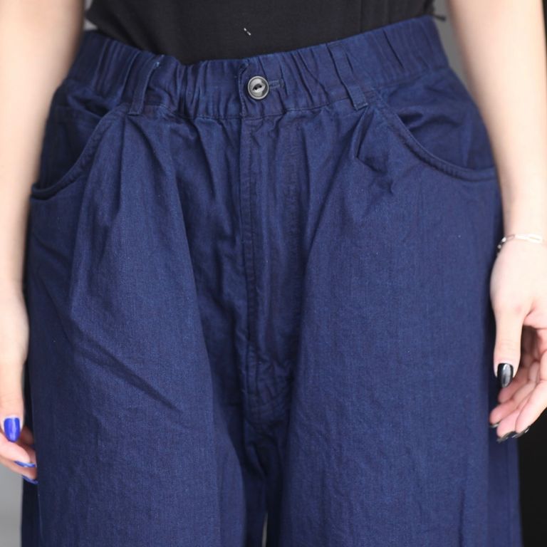 経糸にロープ染色を施したナチュラルなムラ糸が特徴の6オンスライトデニムを使用し製作を行なった本作。ゆとりがあるシルエットのワイドデニムパンツです